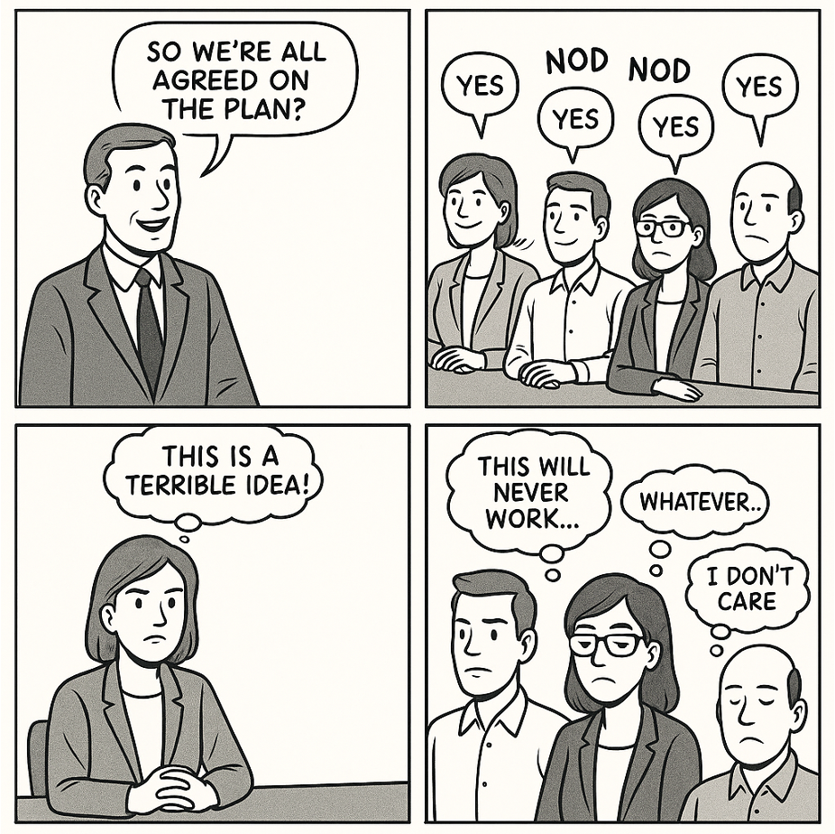 The image above captures the risk leaders must be wary of: visible agreement paired with invisible resistance. Heads nod, “yes” is spoken, but internally, people are disengaged, unconvinced, or quietly opposed. Strategy built on that foundation rarely holds.
